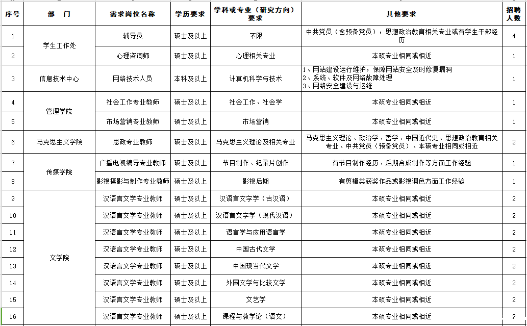 2.学校招聘工作统一由学院人事处负责组织实施,所有招聘信息均会通过我学校官网、官微发布,且不会以任何名义收取费用。对于学校未对外公开发布的招聘信息请求职者注意甄别、核实,勿轻信其他途径的虚假信息而上当受骗。