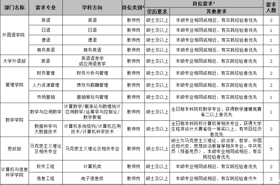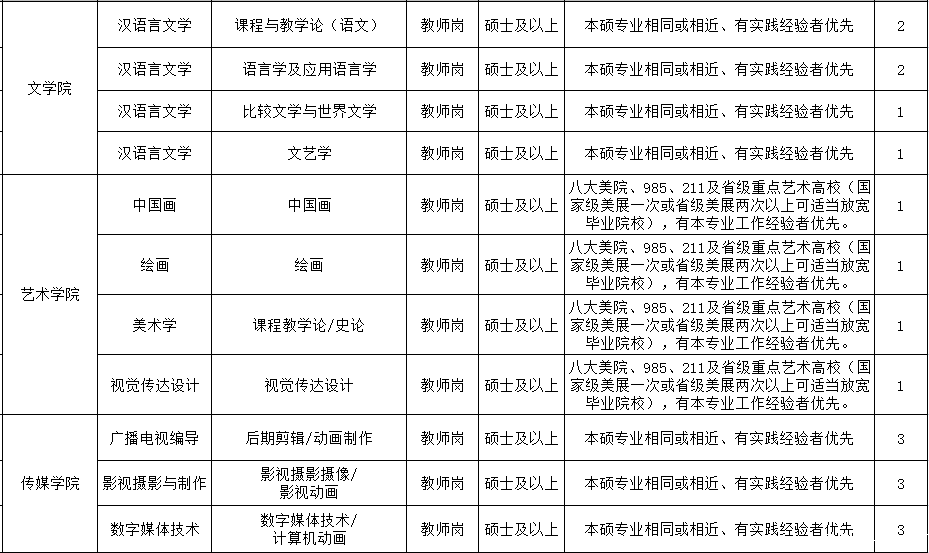 要求各岗位应聘者第一学历须为公办高校全日制本科,且硕士及以上学历,应聘教师岗位要求本硕专业相同或相近;海外学历须持有教育部留学归国服务证明;具有讲师及以上职称优先。