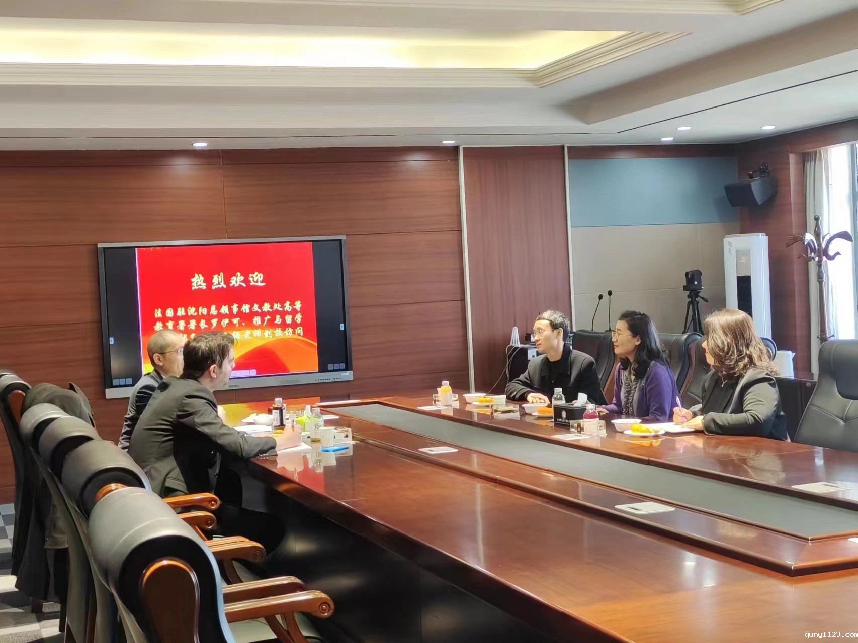 3月16日上午,法国驻沈阳总领事馆文教处高等教育署署长罗伊可、推广与留学指导部负责人王强老师访问我校。国际合作与交流处处长杨慧、外国语学院院长助理冯立群、国际交流与合作处科长王姝航及外国语学院相关人员接待来访。
